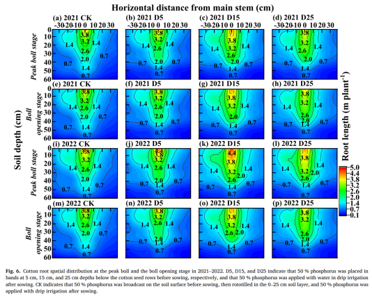 随着新疆滴灌棉花生产水肥一体化技术的发展和应用,磷肥施用方式逐渐由全部基施向基施与追施相结合或全程追施转变。由于磷肥的低移动性,不合理的施用方式导致大田耕层磷肥易出现“上肥下浅”的不均衡分布,严重影响磷肥吸收与利用效率。本研究针对如何高效精准施用磷肥,利用靶向精准定位与水肥一体化技术研究了滴灌棉花不同深度基施磷肥对棉花生长的影响。试验通过设置不同施磷深度(0(撒施), 5 cm、15 cm和25 cm,分别记为CK, D5、D15和D 25,占施磷量50% )和追施(剩余50%)等处理发现最佳施磷深度(15 cm)增加了10-40cm土层的土壤磷有效性,促进根系生长,优化根系在10-40cm土层中的分布。与CK相比,D15处理分别显著提高了磷素利用率30.67 %和籽棉产量10.98 %。本研究提出了磷肥精准靶向施用新方法,增加了磷肥利用率,为棉花精准高效水肥管理提供技术支撑。